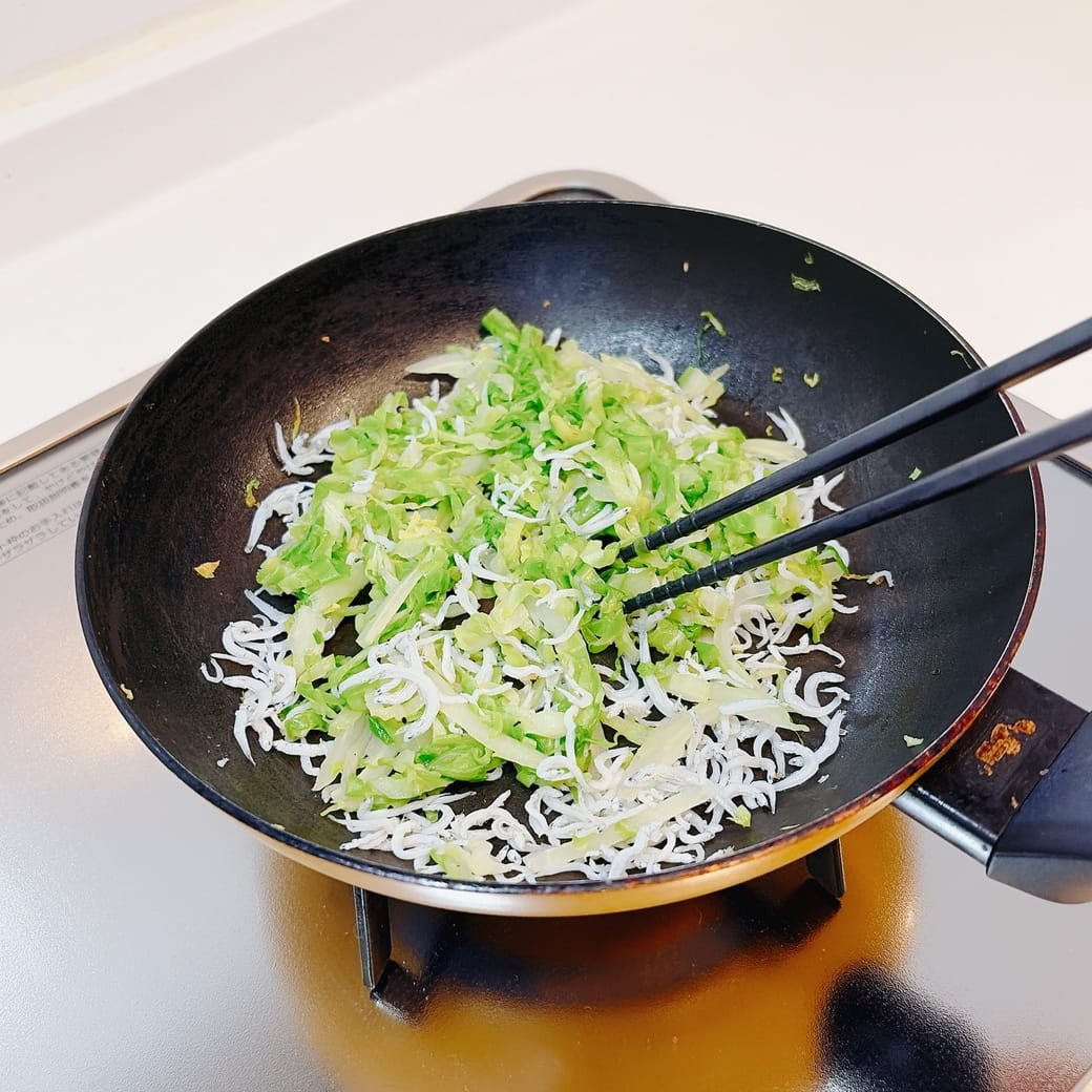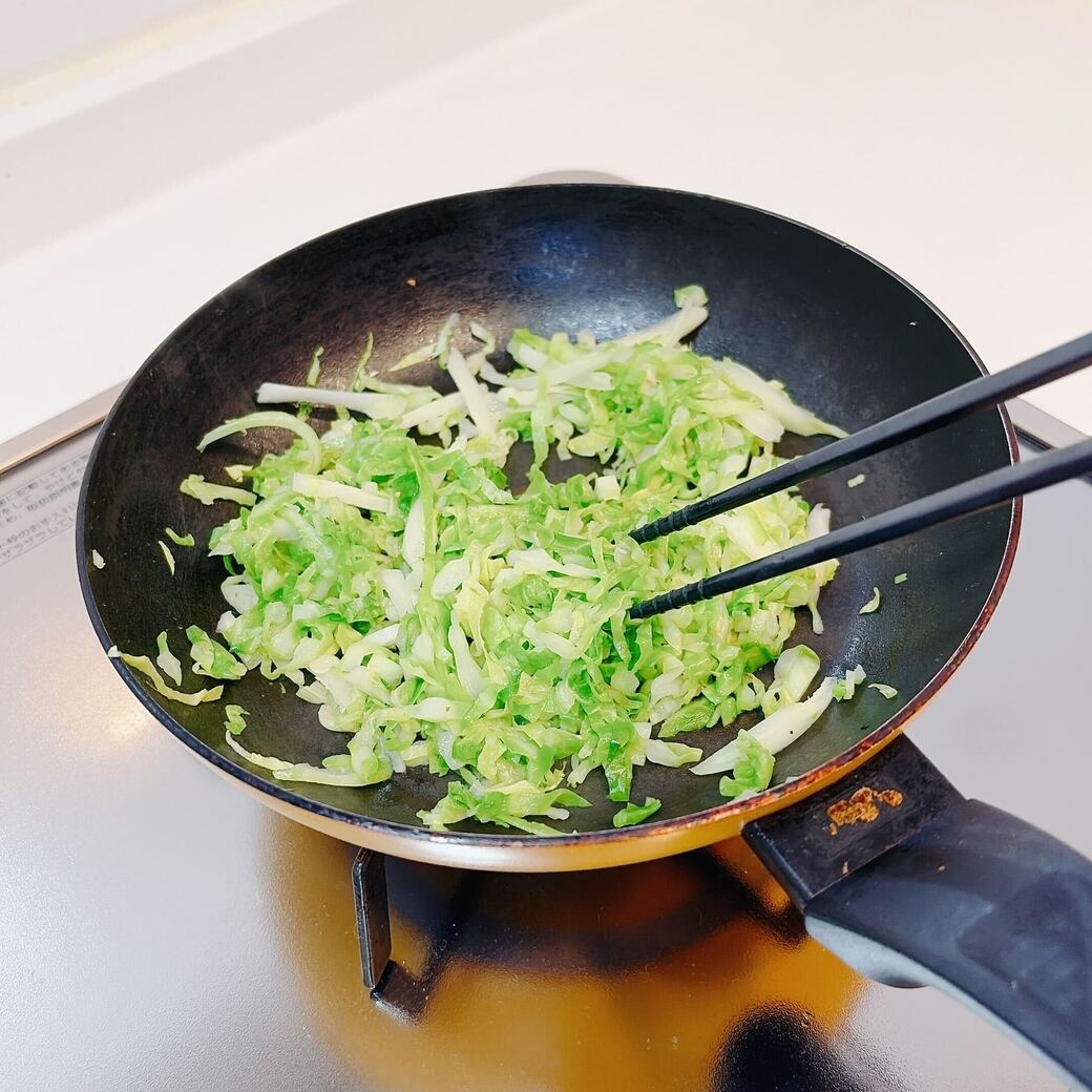 ⑴春キャベツを粗めの千切りにし、フライパンでしんなりするまで炒める