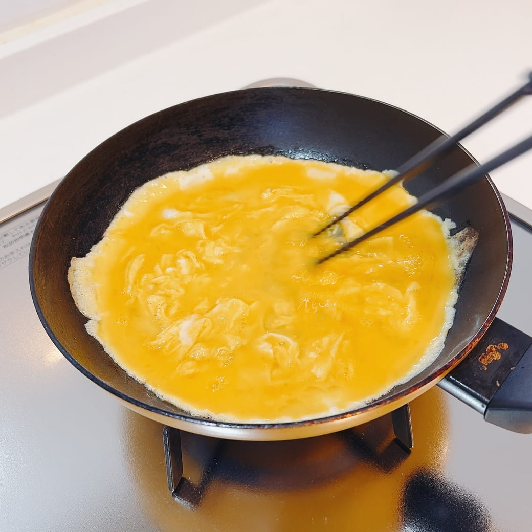 ⑷同じフライパンをきれいにして油をひき、卵液を流し入れ、焼きながら菜箸でくるくると混ぜる