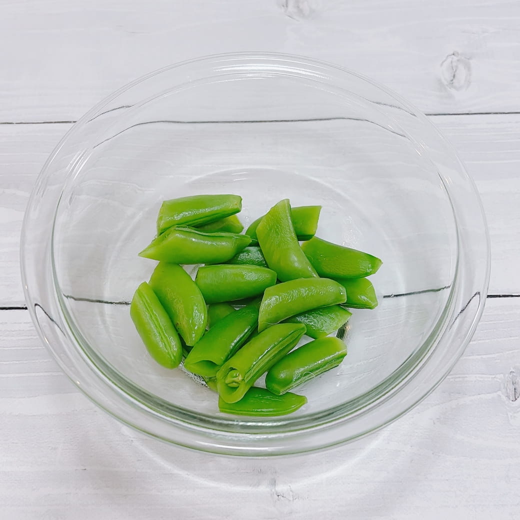 ⑴スナップエンドウは筋をとり、塩を少々加えたお湯で1分ほどゆでる