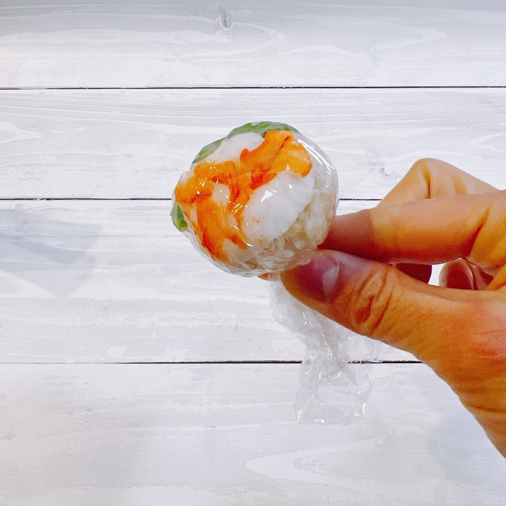 ⑷ラップの上に1/2に切ったエビと菜の花を置き、酢飯(1個約20g)をのせ、茶巾絞りのように丸く形を整える