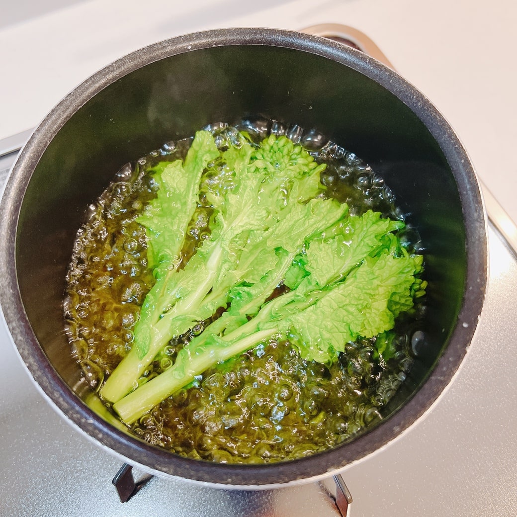 ⑶菜の花を塩少々(分量外)を入れたお湯で茹で、冷水にとってから水気を切り、3㎝ほどに切る