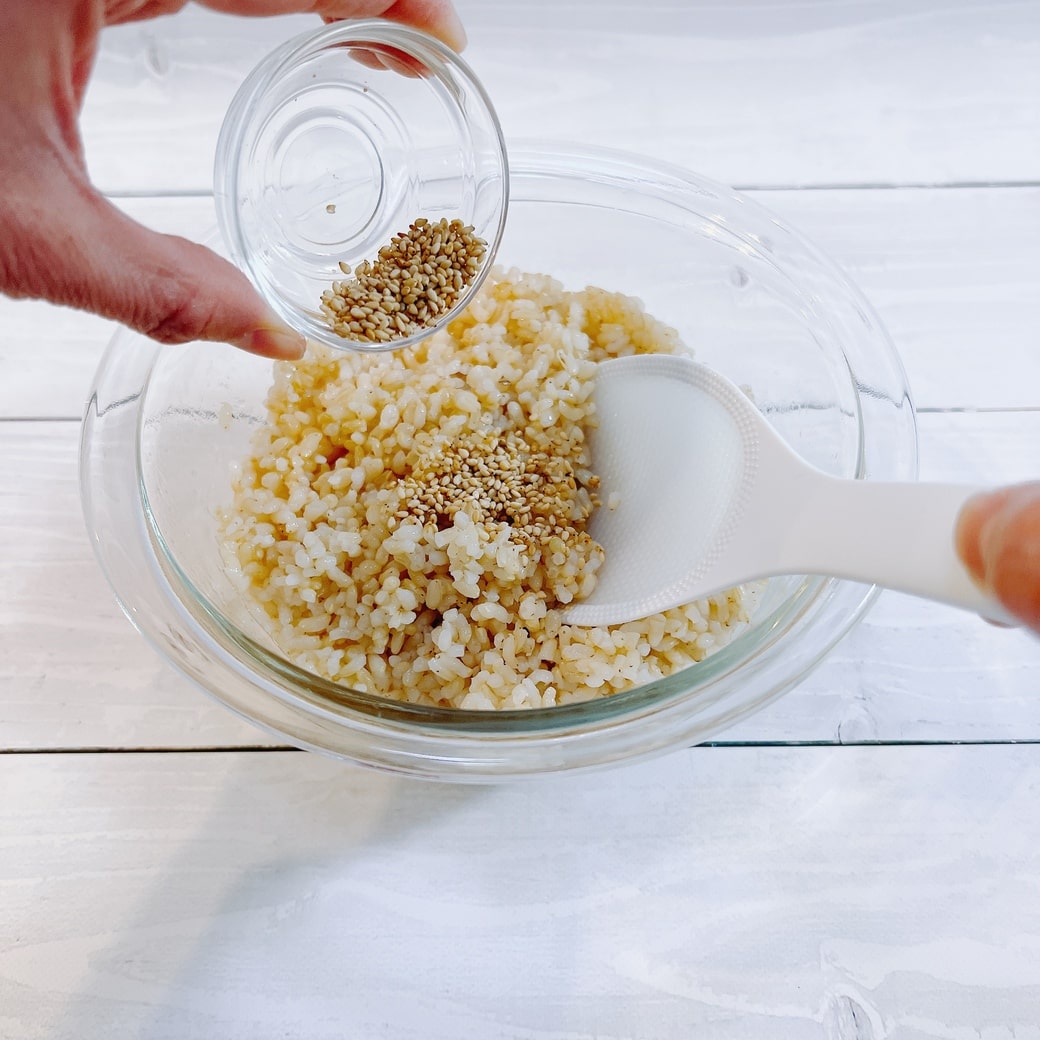 ⑵ご飯にすし酢を混ぜて酢飯を作り、白ごまも加えて冷ましておく