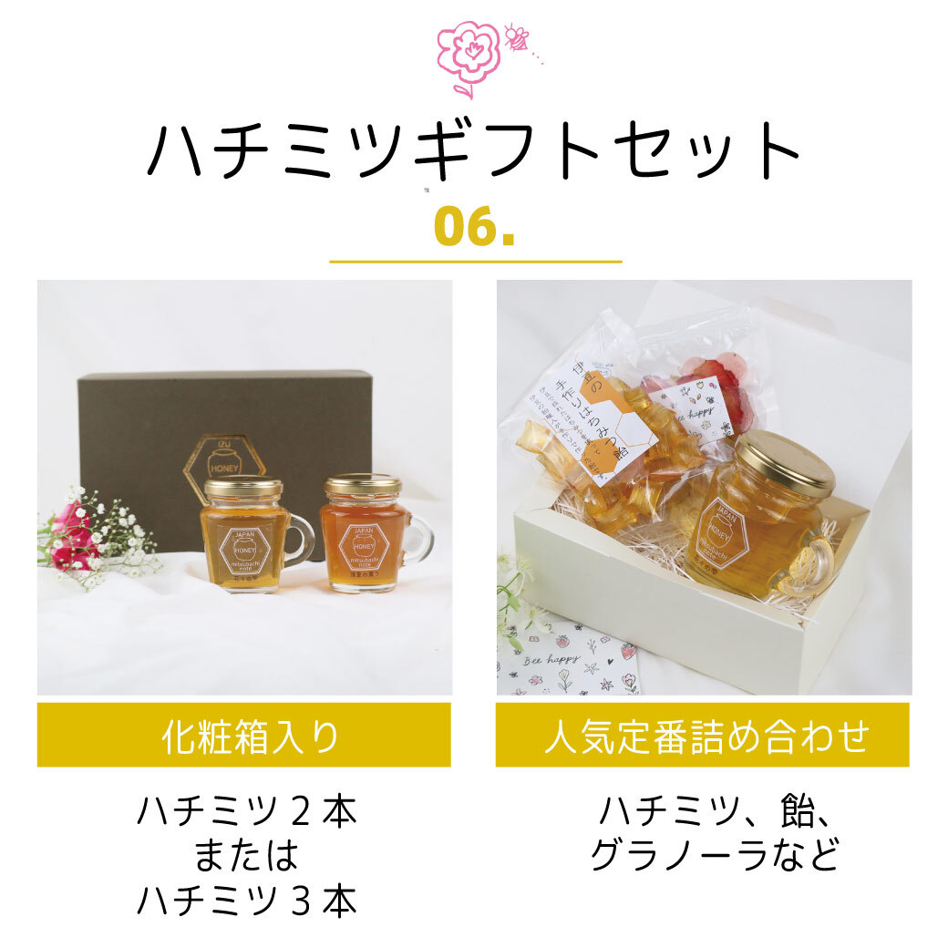 身体にも心にも優しく美味しい、毎日使える『ハチミツ』が化粧箱に入った「ハチミツ化粧箱」や「ハチミツ定番セット」。