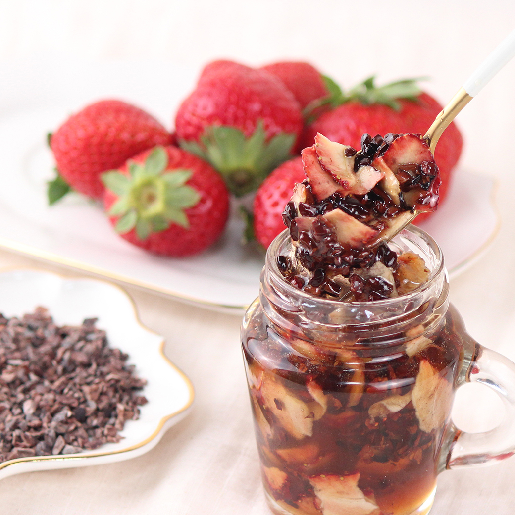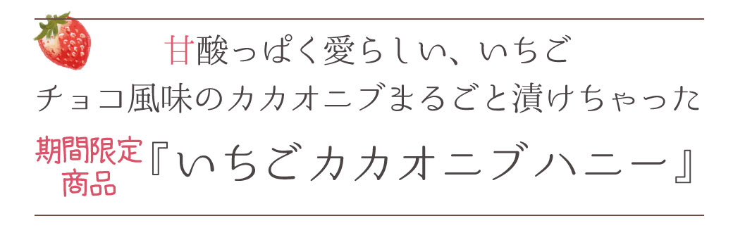 可愛くて美味しいいちごと、チョコレートの様なカカオニブと優しい甘さのハチミツが一緒になったいちごカカオニブハニー