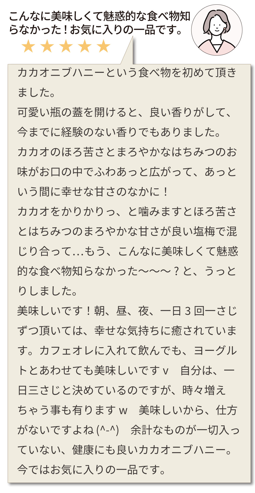 ※カカオニブは浮いてくるので、食べる前は少しハチミツとかき混ぜてから使ってくださいね。