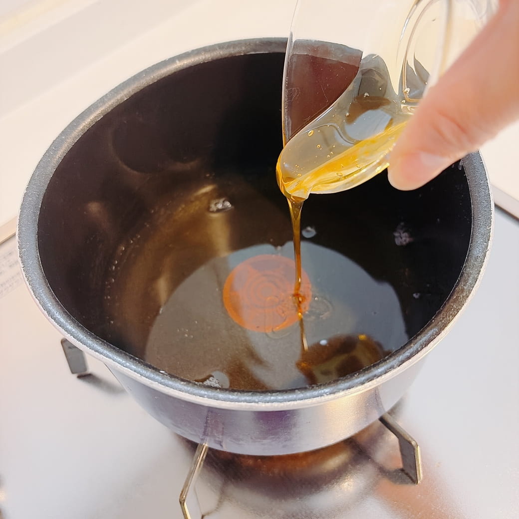 ⑵白ワイン、ハチミツの順で加え、粗熱がとれたら冷蔵庫で固める