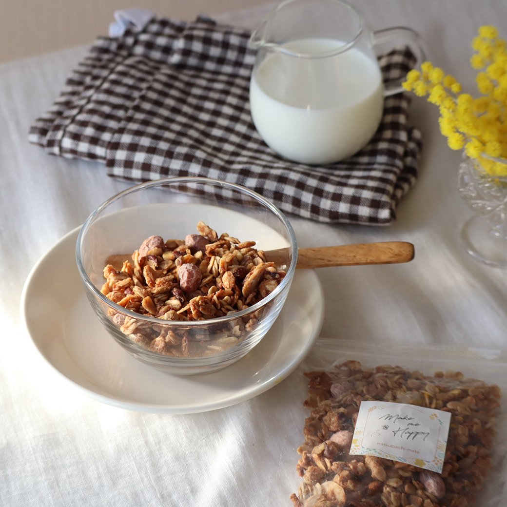 少し温めてかけると、豆乳のコクと相まって和風グラノーラを一層楽しめます。