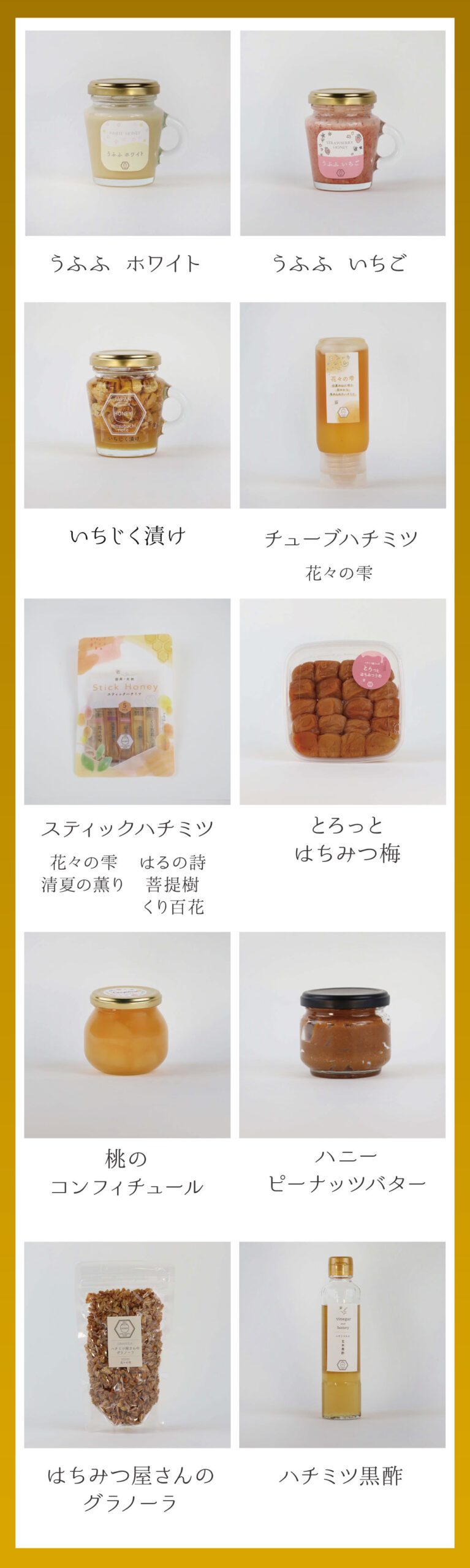 | 原材料名 | うふふホワイト、花々の雫、清夏の薫り、琥珀の輝き、そば百花、さくらの雫、菩提樹、スティックハチミツ:国産はちみつ うふふいちご:国産はちみつ、いちごパウダー ゆずハニー:国産はちみつ、ドライゆず いちじく漬け:国産はちみつ、白いちじく(イラン産) ナッツ漬け:国産はちみつ、アーモンドナッツ(アメリカ産)、ピーカンナッツ(アメリカ産)、カシューナッツ(アメリカ産)、くるみ(アメリカ産) カカオニブハニー:国産はちみつ、ローカカオニブ(エクアドル産) ハチミツ黒酢:米黒酢(三重県特別栽培玄米使用)、ハチミツ(国産) 桃のコンフィチュール:桃(国産)、国産はちみつ、レモン果汁 ハニーピーナッツバター:落花生(八街産千葉半立)、国産はちみつ、なたね油 とろっとはちみつうめ:梅(三重県産)、漬け原材料(塩(天日塩)、国産ハチミツ、発酵調味料、オリゴ糖)、調味料(アミノ酸等)、酸味料、甘味料(ステビア)ビタミンB1 はちみつ屋さんのグラノーラ:有機オーツ麦(アメリカ産)、ハチミツ、有機小麦全粒粉、ココナッツオイル、アーモンドスライス、有機ひまわりの種 |