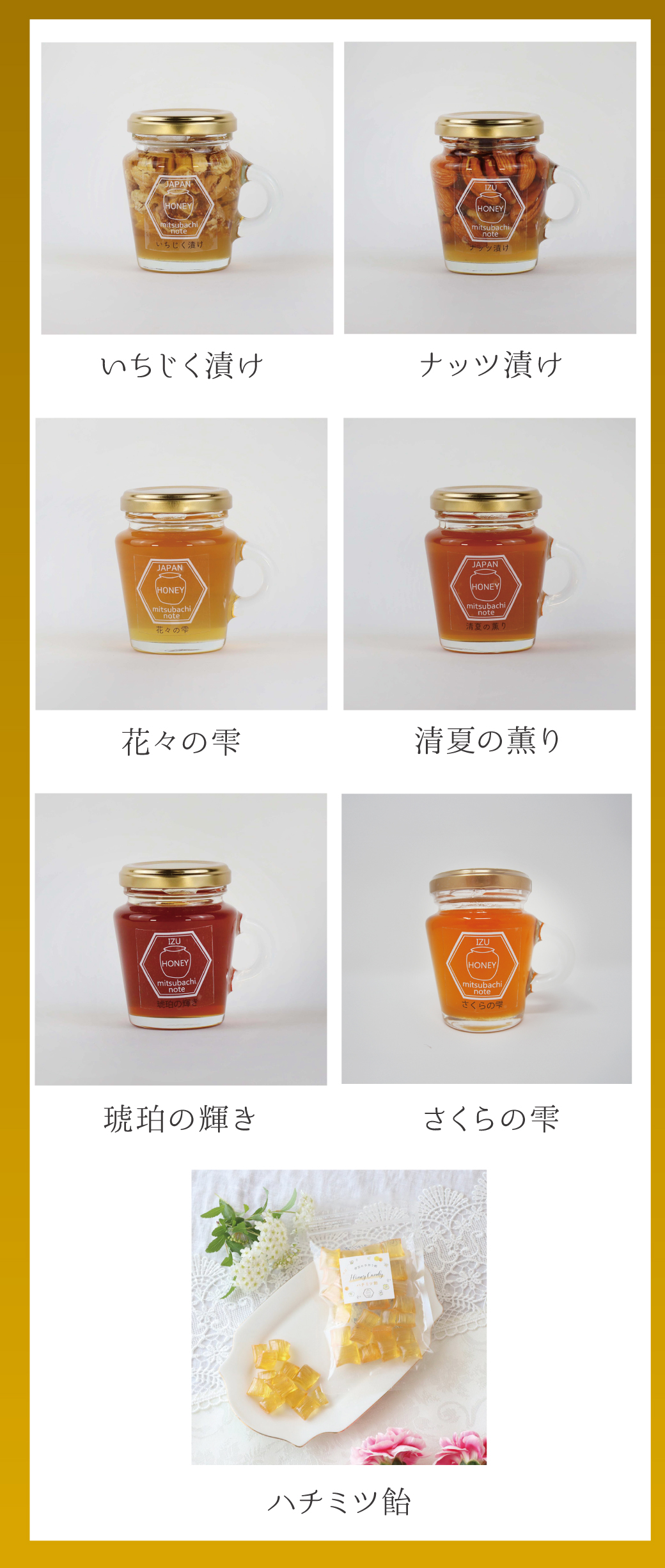 | 原材料名 | うふふホワイト、花々の雫(ビン・チューブ)、清夏の薫り、琥珀の輝き、さくらの雫、スティックハチミツ:国産はちみつ |