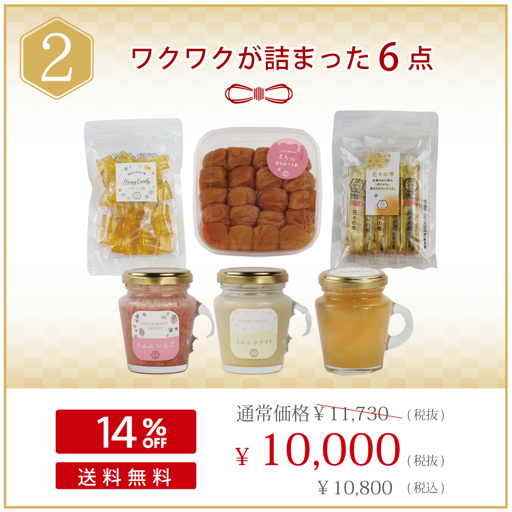 『6点10,000円セット』では、期間限定「うふふ ホワイト」や「スティックハチミツ」、「とろっとはちみつうめ」など…