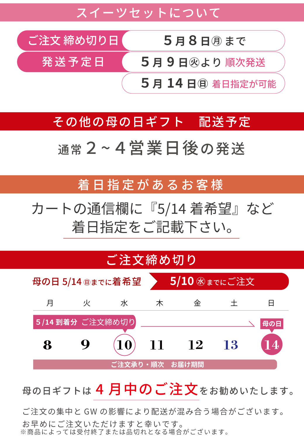 ※5月10日(水)以降のご注文は、5月14日(日)の母の日までに商品をお届けが確約出来かねますので、あらかじめご了承ください。