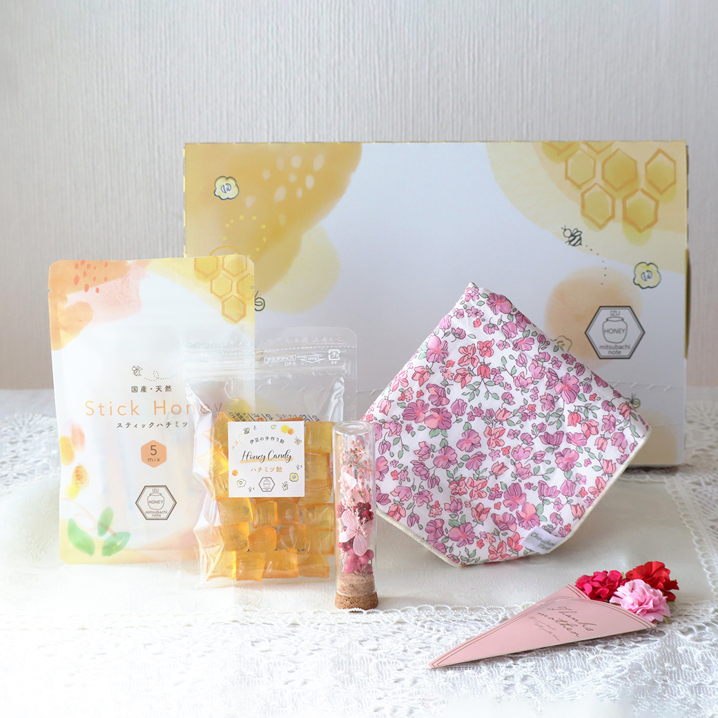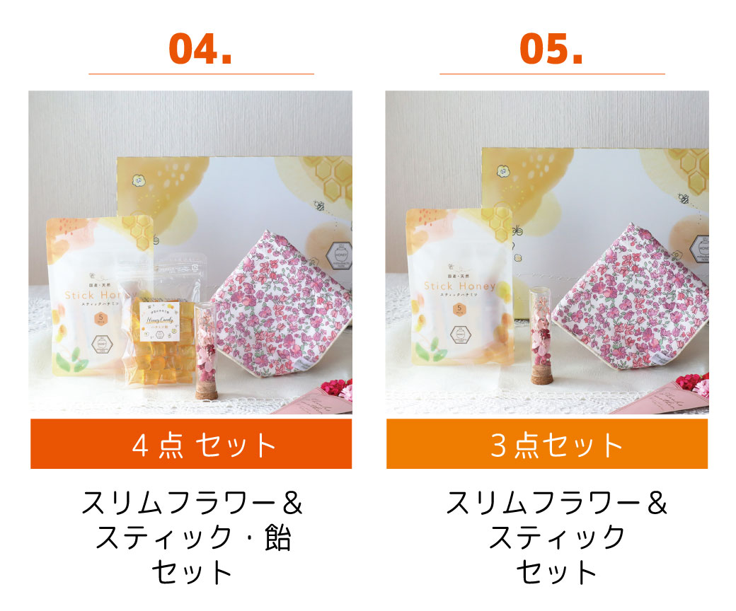 「スリムフラワー&スティックセット」は、使いやすい「スティックハチミツ」見た目も肌触りも優しい「ハンカチタオル」
