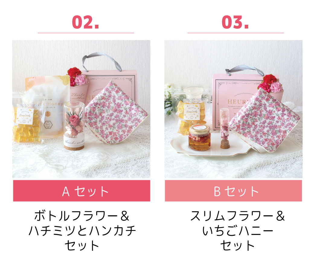 お母様のお好みに合わせて、お花やハチミツをお選びいただけるようご用意しました。