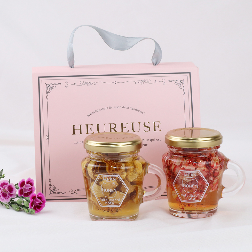 『2本用ギフトボックス』は、可愛らしさ溢れるピンクのギフトボックスに2本のハチミツが入った状態でお届けさせて頂くセットです。
