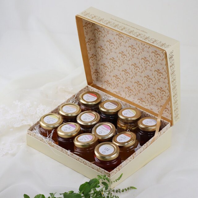 身体にも心にも優しく美味しい、毎日使える「漬けハチミツ」や「定番ハチミツ」が化粧箱に入った「ハチミツ化粧箱」。