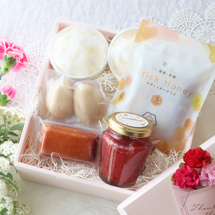 今回は母の日ということで、大人気「ハチミツと苺のコンフィチュール」と生産者こだわりの「レモンの香るマドレーヌ」や「フィナンシェ」、「クレメ・ダンジュ」